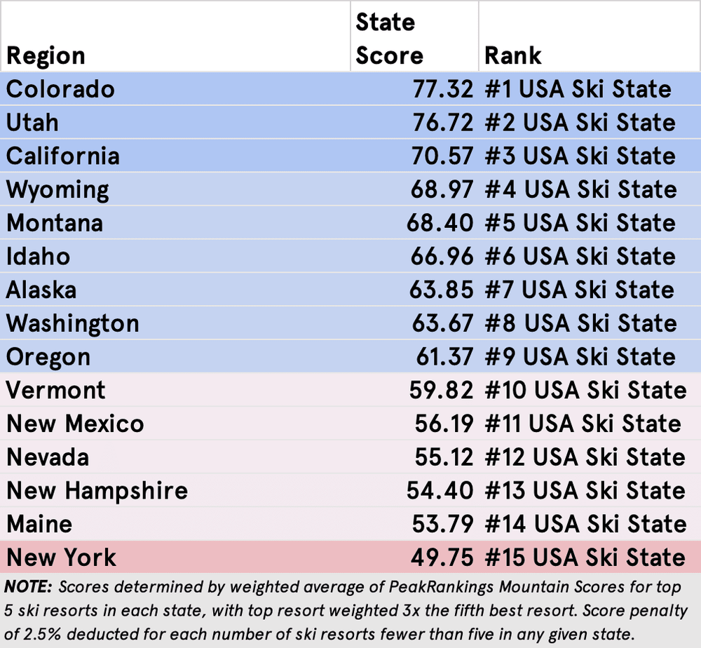 So that’s our rank order of the best ski states in the USA. Here’s an overview of each state’s weighted State Score, which is determined by the weighted average of PeakRankings Mountain Scores for the top five ski resorts in each state.