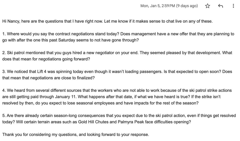 After talking with pretty much every other party that was affected by the strike, the final group we hadn’t heard from was Telluride’s management itself. Unfortunately, I learned while on the slopes that talking to someone live was going to be very difficult, as the PR director for Telluride was the only person who was authorized to give a statement and she was out of office. One of the mountain information folks was nice enough to give me her contact details, and I asked to organize a chat with her to get her statement on the situation. She asked if I could email her the questions I had. Those questions and her response are pictured below.