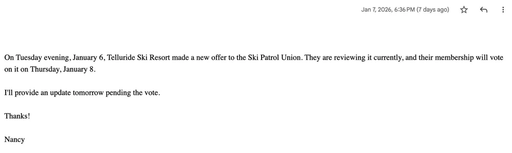 It also recently emerged that Mountain Village’s mayor and Telluride’s mayor pro tempore flew to California to meet with resort owner Chuck Horning shortly after the strike began to explore a majority buyout of the resort. The plan was not successful. Notably, the Mountain Village mayor has a background as a ski patroller, but was not part of the union or strike action. The meeting was not disclosed in advance to the town council, quickly became controversial, and triggered an internal investigation. The Mountain Village mayor resigned days later.
